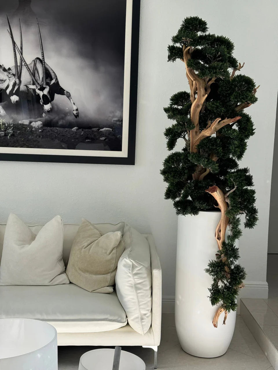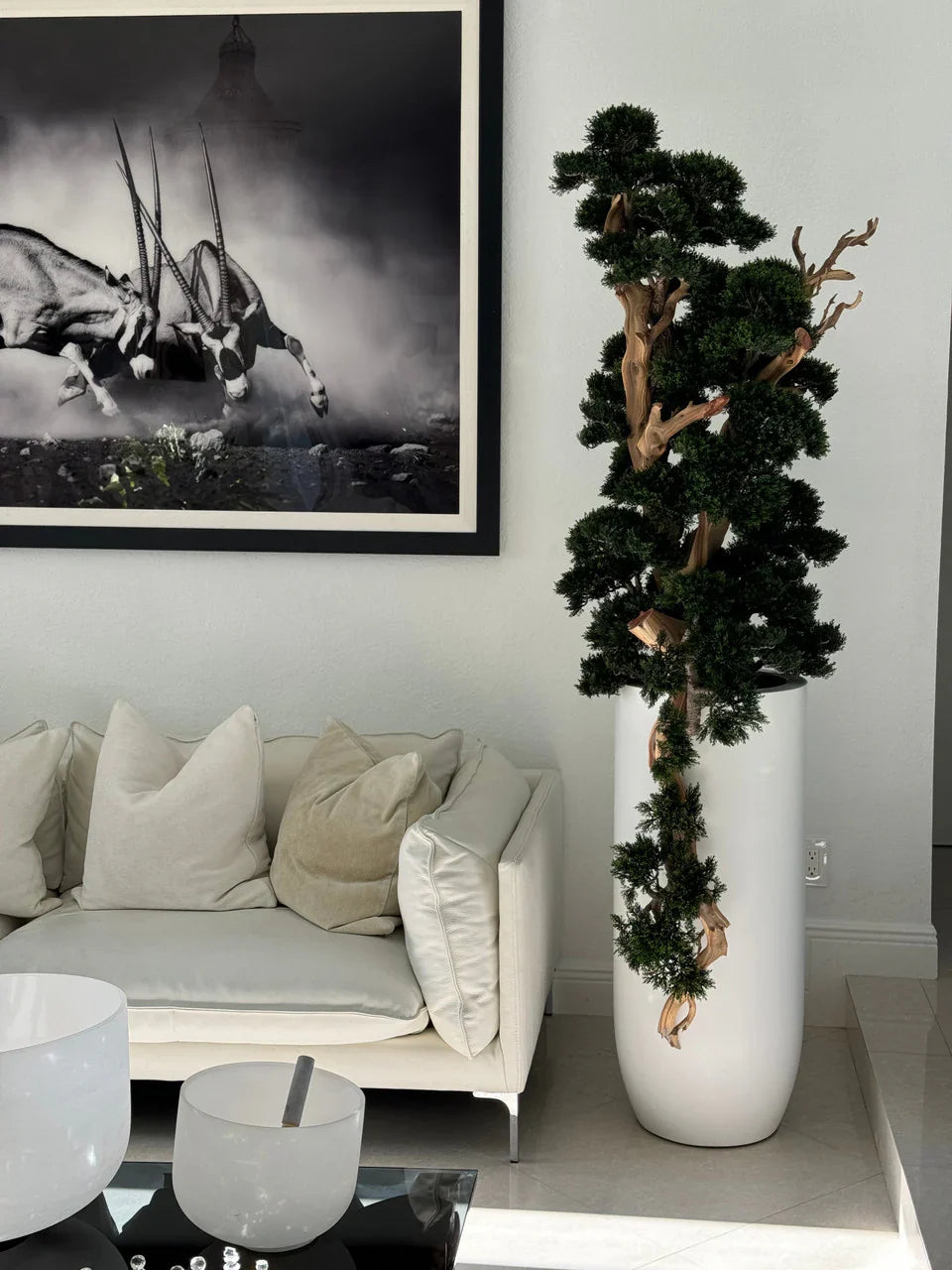 The tree is paired with the St. Tropez planter, a tall, elongated vessel finished in a soft matte white. Its slim, smooth profile brings a refined, contemporary edge to the classic bonsai form, making it a versatile statement piece for both interiors and exteriors.
