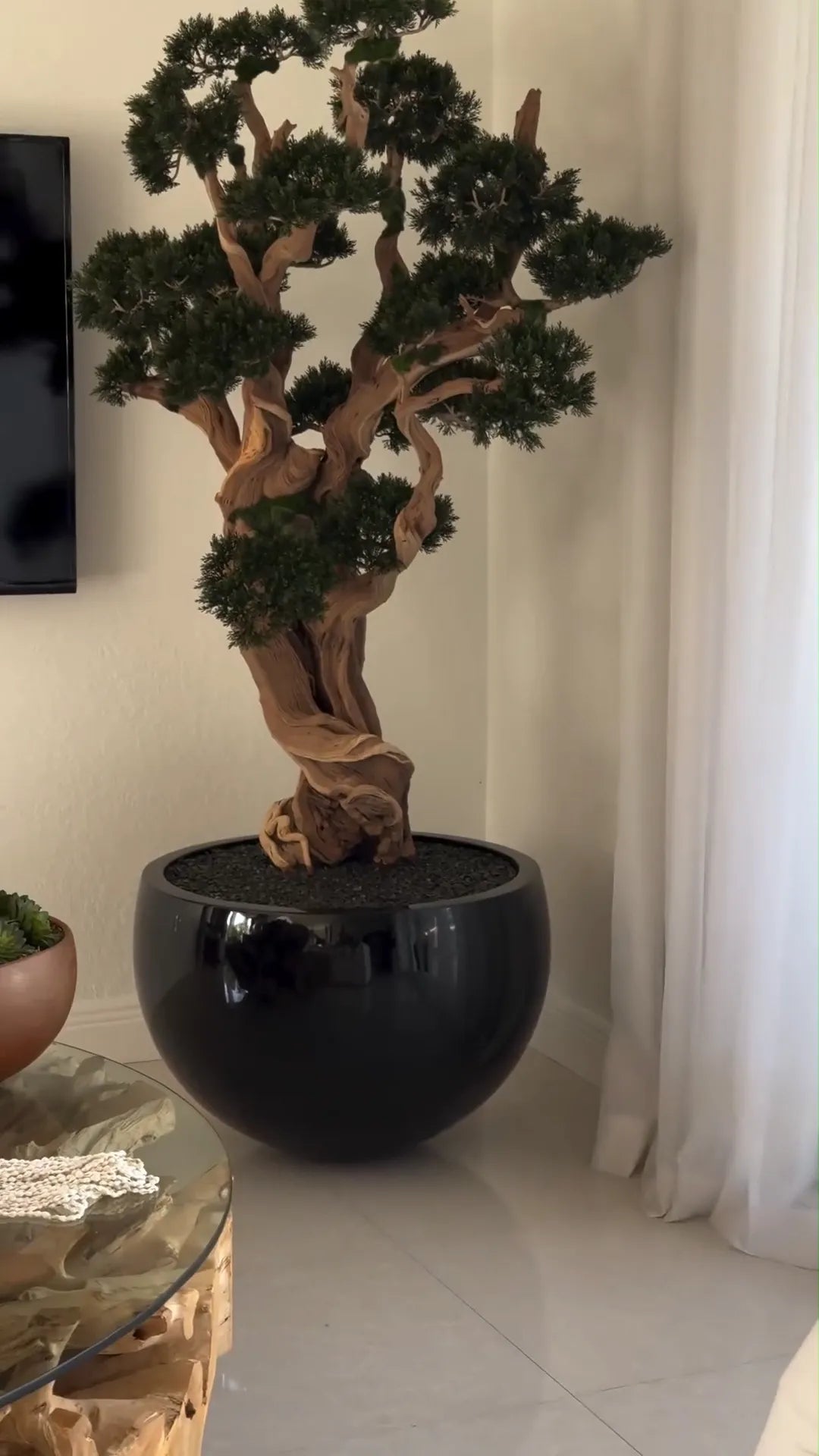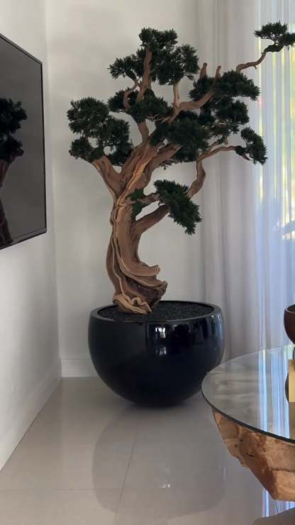 Set in the Glossy Black Terragona planter, the bonsai’s sculptural silhouette is enhanced by the planter’s sleek reflective finish and modern form. The bold contrast of deep black and lush greenery creates a sophisticated, meditative statement piece for living rooms, offices, hotels, or foyers. At 7 ft (213 cm) tall, this arrangement is designed to impress while instilling tranquility.