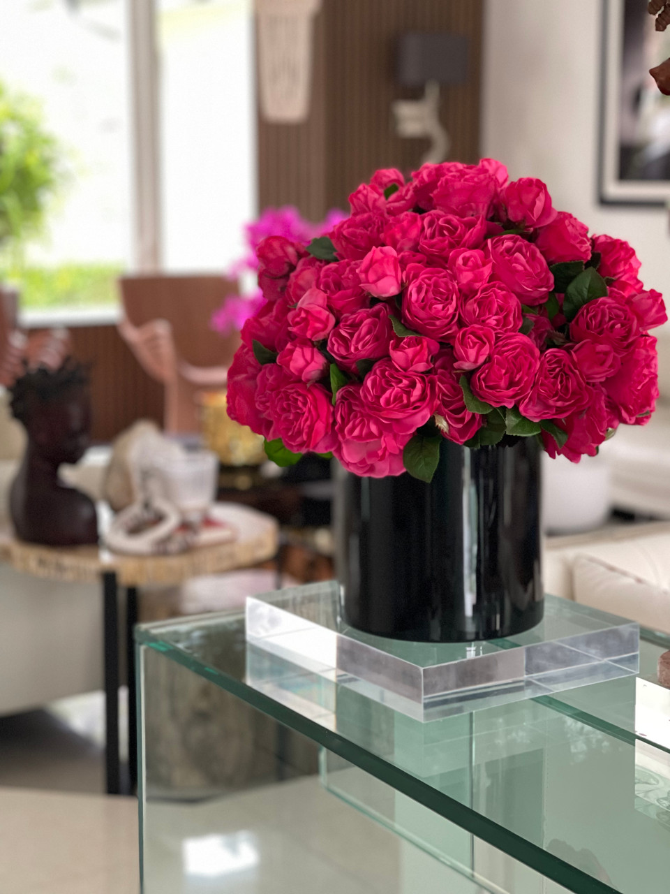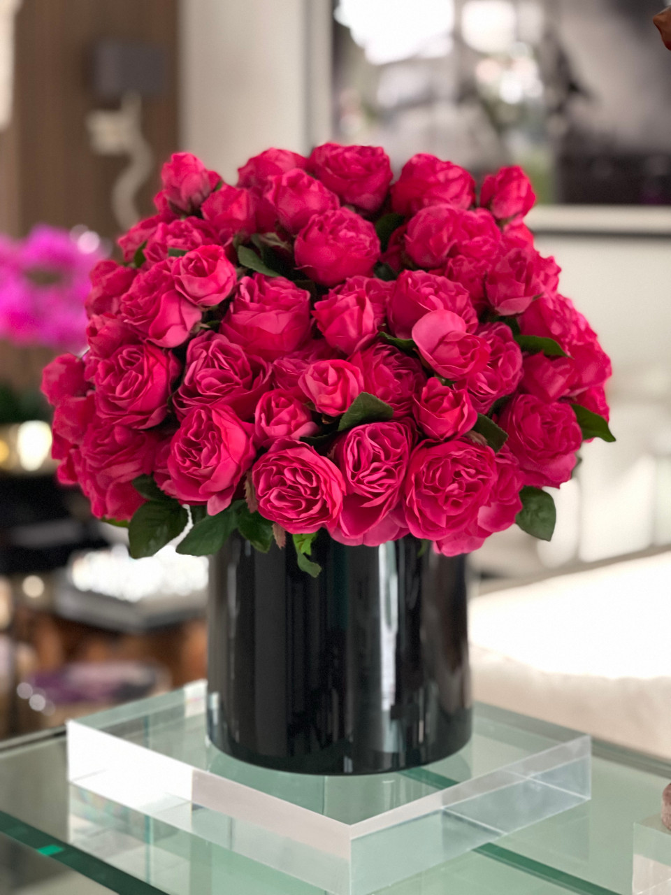 Dark Pink English Roses in Black Glass Cylinder Vase