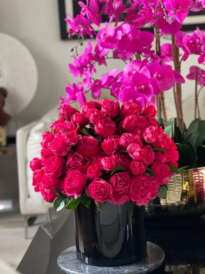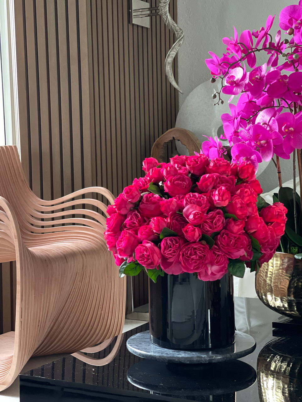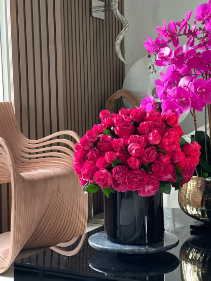 An exquisite exhibition unfolds as a cluster of deep pink English roses burst into bloom. Adorned with fully blossomed, partially bloomed, and delicately unfurling rose buds, they are artfully arranged within a sleek black glass vase, adding a timeless touch of organic allure. This unstructured composition, with its vibrant dark pink hue harmoniously contrasting against the obsidian vessel, evokes an atmosphere of refined grace and fervent ardor.