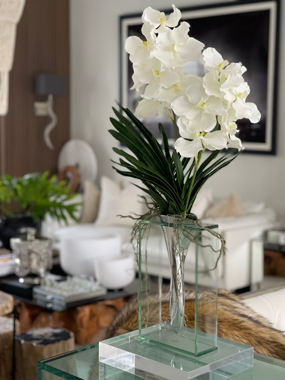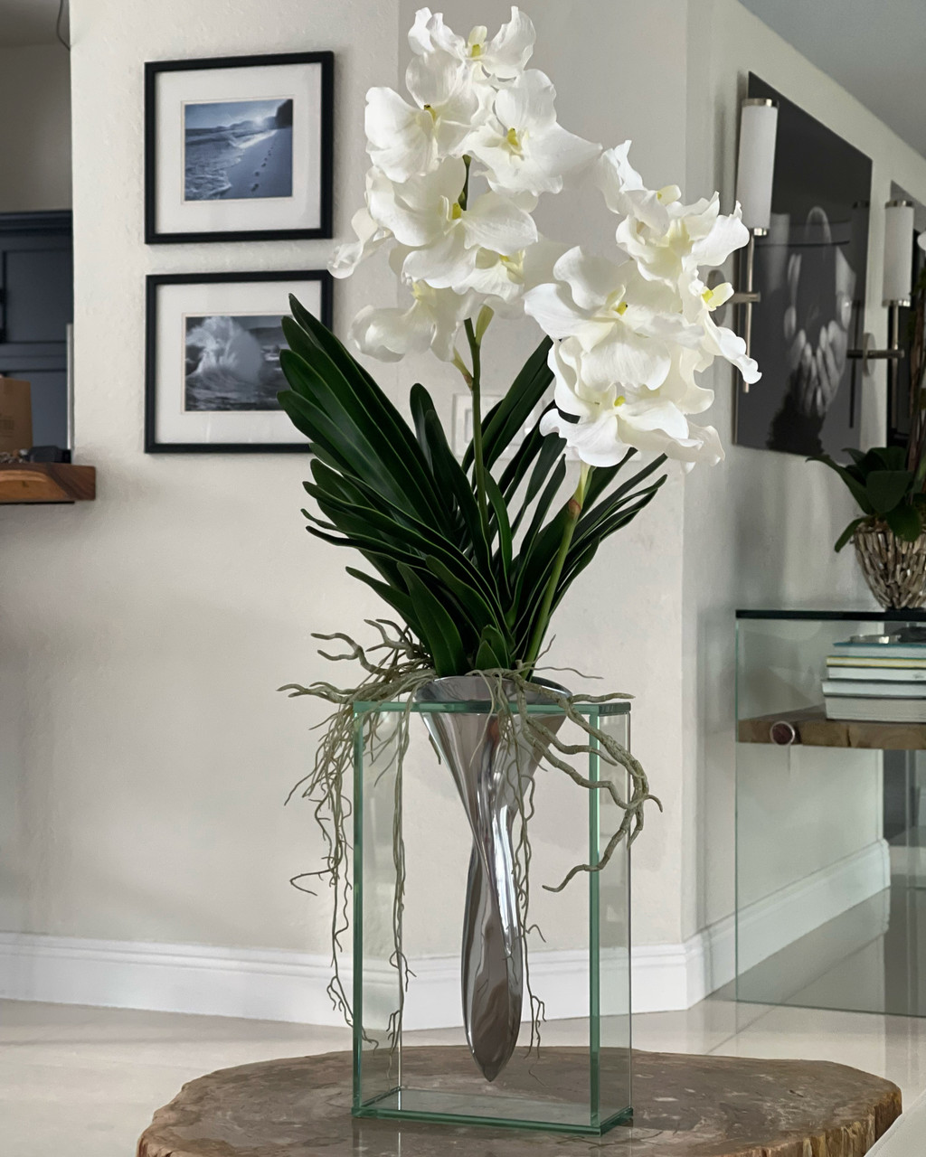 The Elvis Vase is a mover. ¨C its on! His non tarnish aluminum body swivels right through the middle of that glass. Let him hold your flowers. Just like the King. This vase is one solid piece and holds two beautiful vanda orchids in place showcasing its majestic rooting system, foliage and its numerous blooms.?This enduring artificial Vanda orchids arrangement looks stunning anywhere¡ªin any light or climate. Generously scaled, lush, and abundant, this arrangement features broad, true-to-life leaves anchored to our Elvis vase.