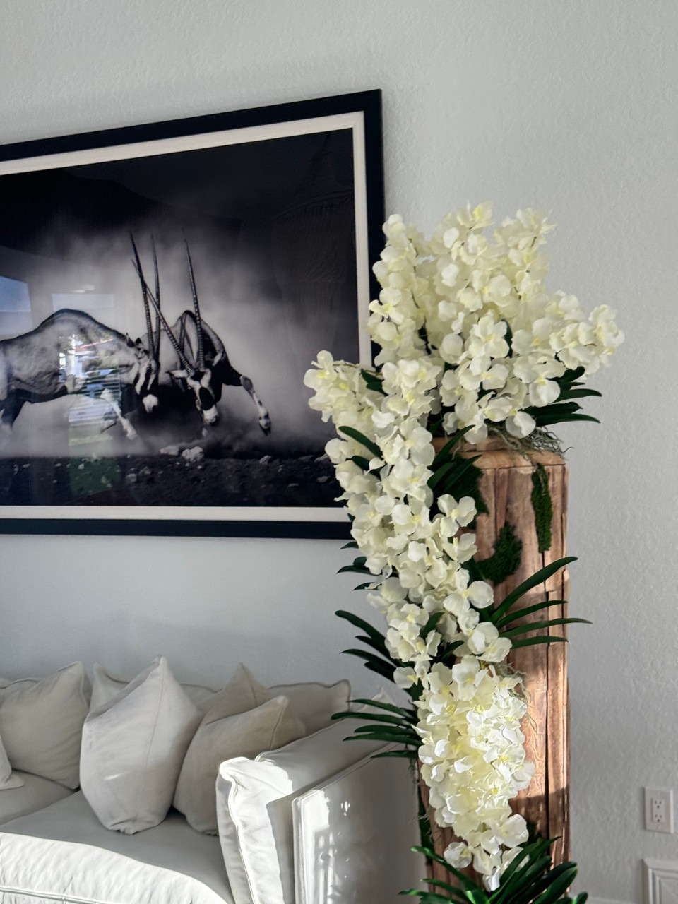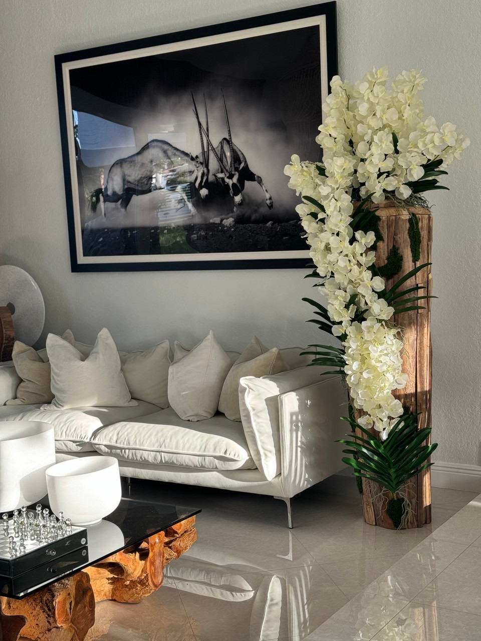 Large Live Edge Teak Vase with White Vanda Orchids