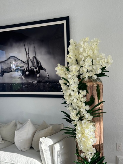 A naturally beautiful 20" diameter x 60" tall teak vase with a subtle natural finish paired with exotic white vanda orchids and leaves. This amazing one of a kind piece is truly a work of art. Designed with Mother Nature in mind, and mimicking their true appearance, these flowers are carefully placed throughout this textured live edge teak vase, beautifully displaying their natural hanging root systems.