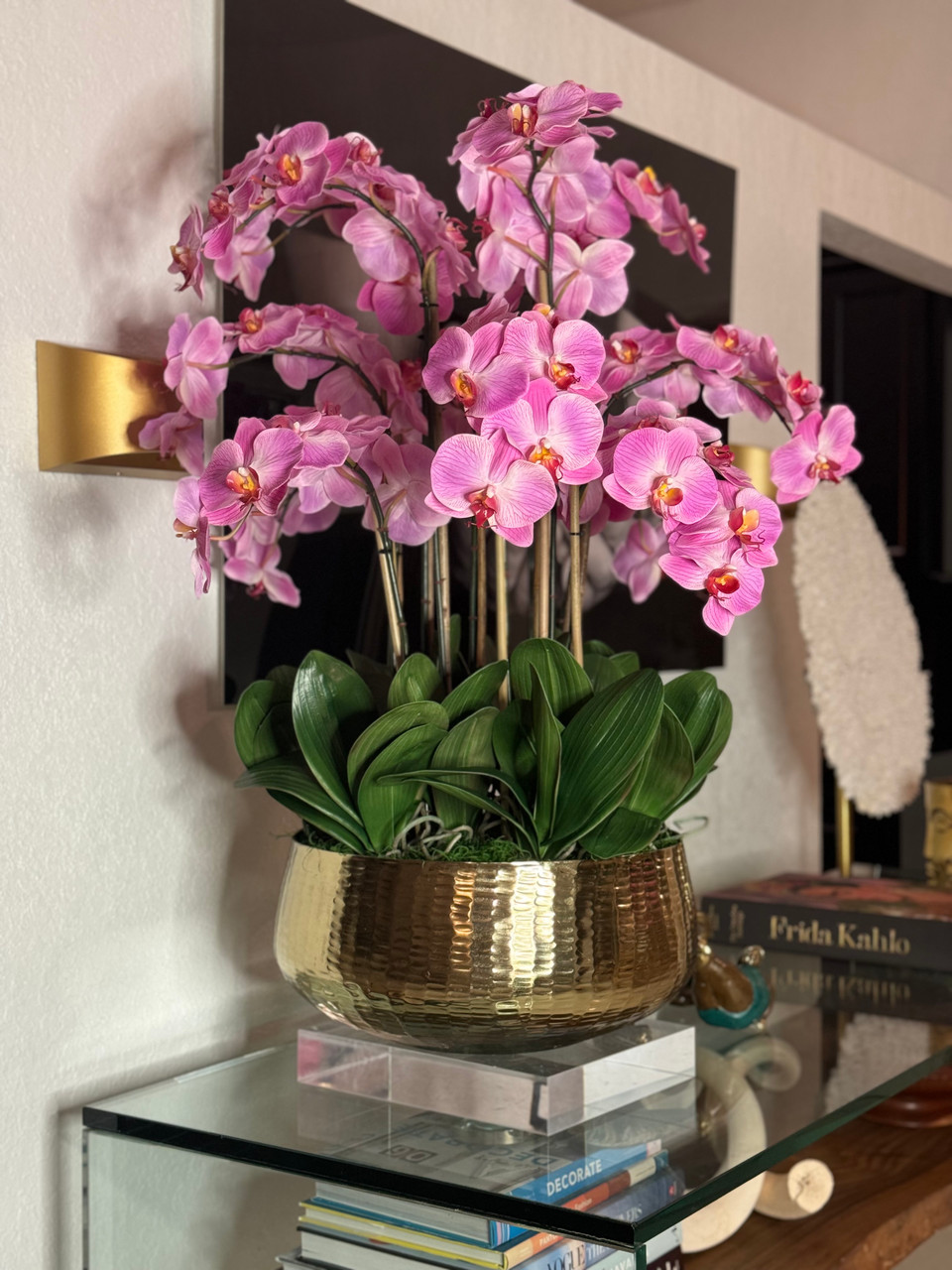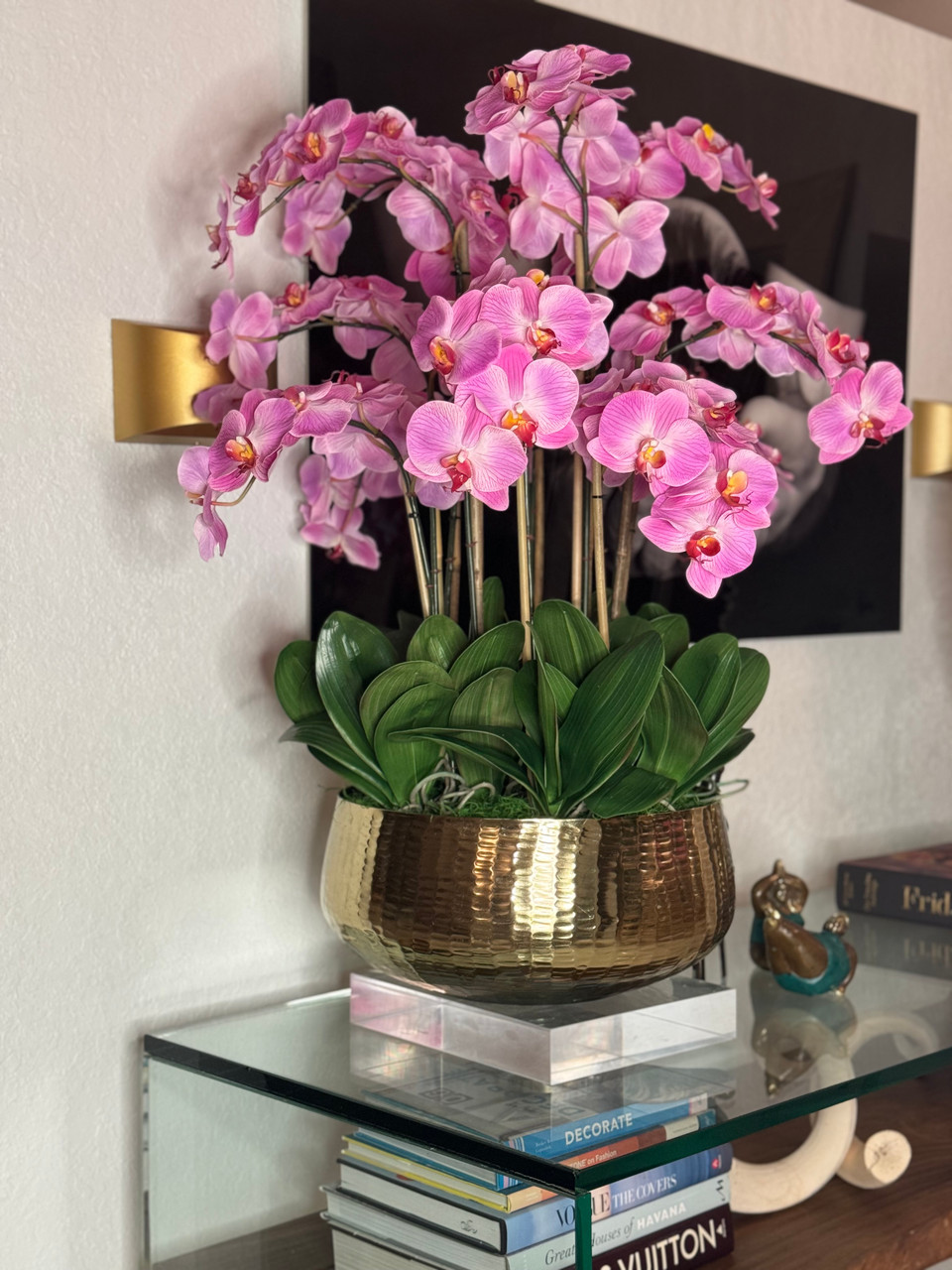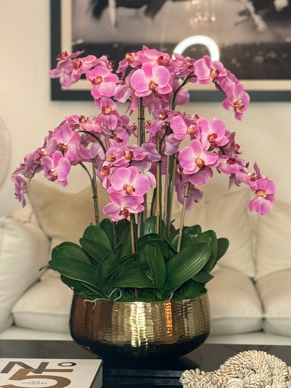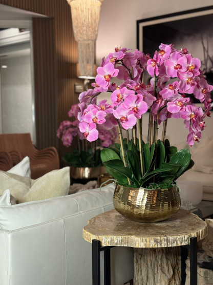 Graceful and exotic, the orchid has symbolized integrity, nobility, and luxury for centuries. Our enduring, light pink phalaenopsis arrangement captures the artistry and spirit of natural orchids. It’s prized for its profusion of perfect blooms. Vertical bamboo stakes, broad green leaves, and a genuine moss base add to the realism of this arrangement. Often called the “moth orchid,” the phalaenopsis is a favorite among our designers for its dense leaves, elegantly arching sprays and lovely blooms. Our remarkably lifelike arrangement is staked into a moss-covered base in an elegant gold planter for a timeless, authentic look that will endure for years to come. This arrangement is just the right size and is versatile enough to use as a coffee table centerpiece, a dining room or console table. It has a luscious tropical feel that will add vibrancy, color and elegance to any room. Available in medium or large Roberi Bowl.