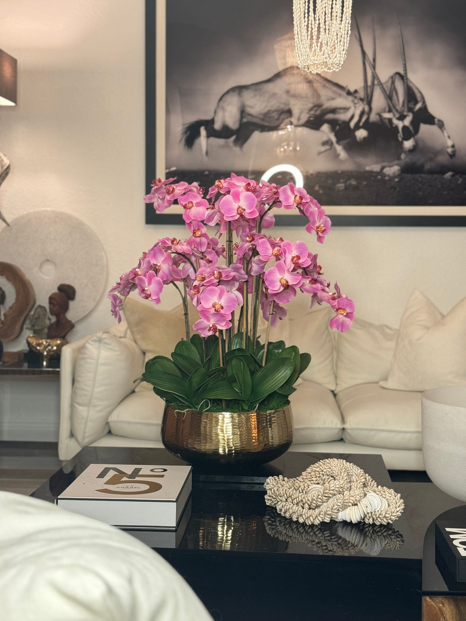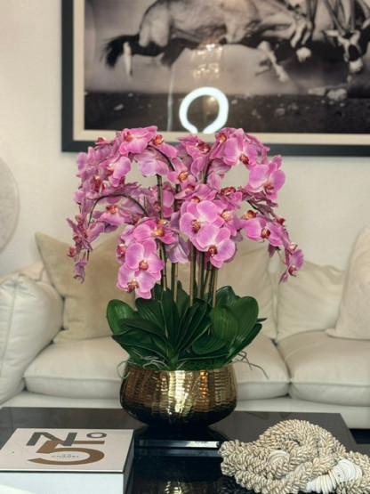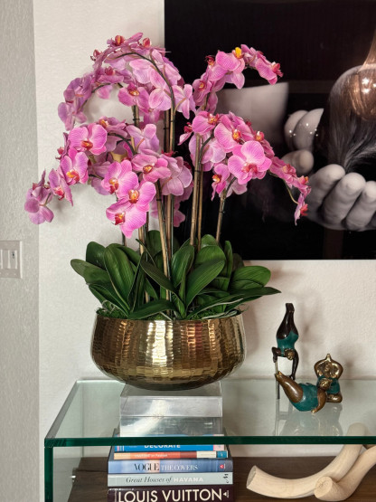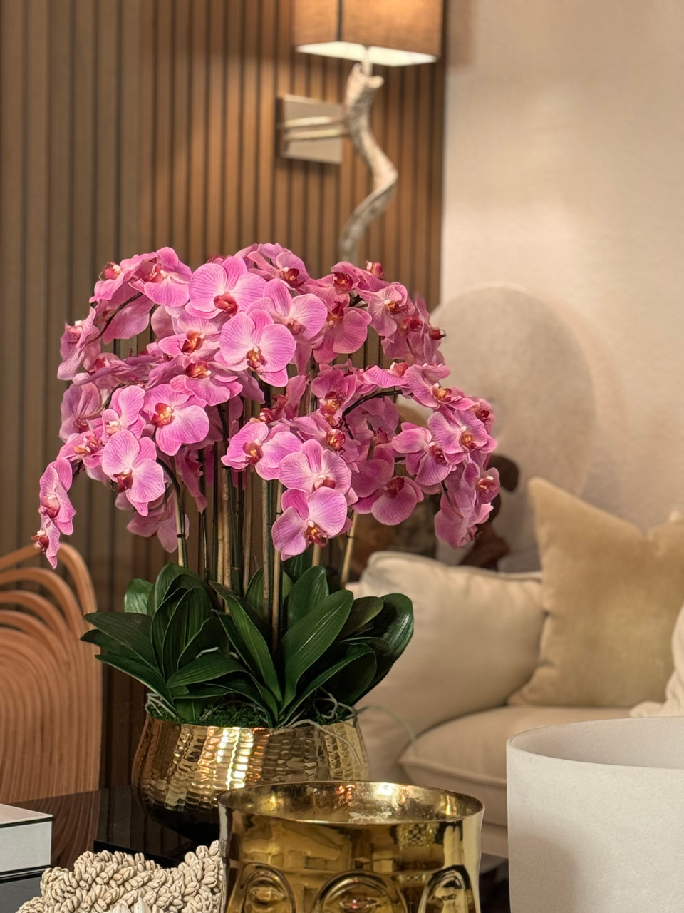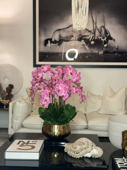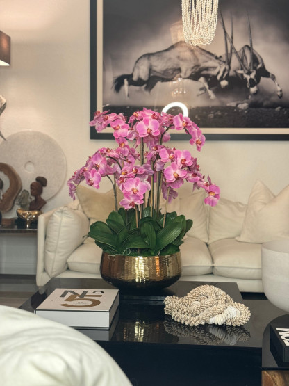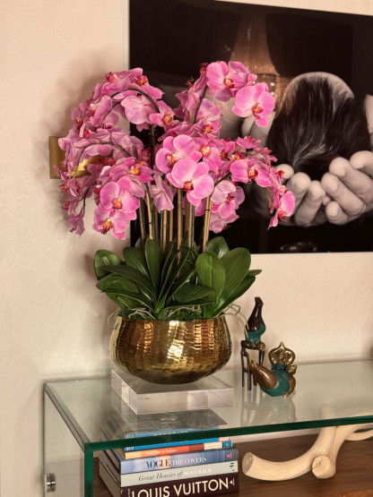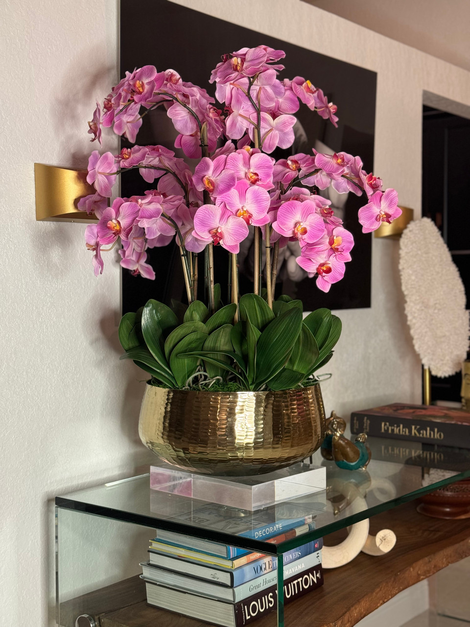 Graceful and exotic, the orchid has symbolized integrity, nobility, and luxury for centuries. Our enduring, light pink phalaenopsis arrangement captures the artistry and spirit of natural orchids. It’s prized for its profusion of perfect blooms. Vertical bamboo stakes, broad green leaves, and a genuine moss base add to the realism of this arrangement. Often called the “moth orchid,” the phalaenopsis is a favorite among our designers for its dense leaves, elegantly arching sprays and lovely blooms. Our remarkably lifelike arrangement is staked into a moss-covered base in an elegant gold planter for a timeless, authentic look that will endure for years to come. This arrangement is just the right size and is versatile enough to use as a coffee table centerpiece, a dining room or console table. It has a luscious tropical feel that will add vibrancy, color and elegance to any room. Available in medium or large Roberi Bowl.