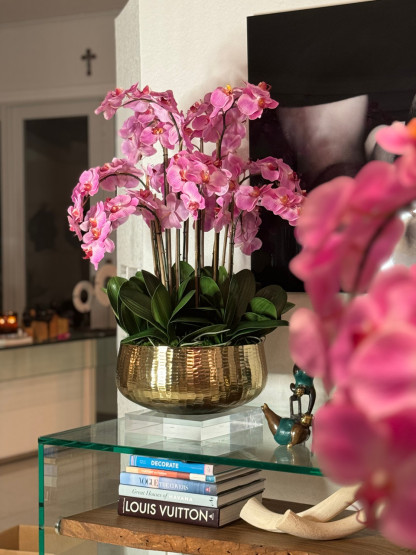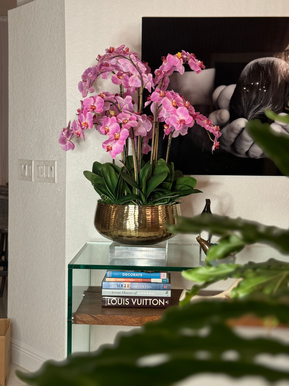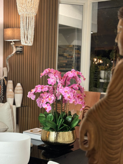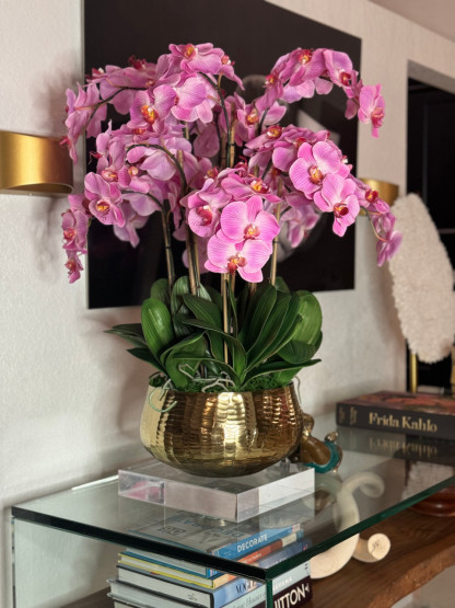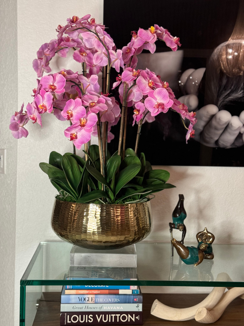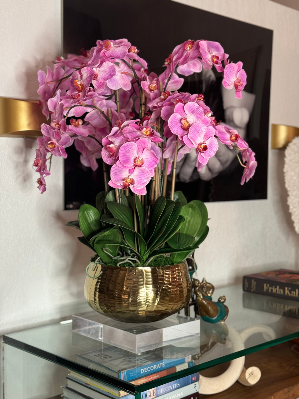 Graceful and exotic, the orchid has symbolized integrity, nobility, and luxury for centuries. Our enduring, light pink phalaenopsis arrangement captures the artistry and spirit of natural orchids. It’s prized for its profusion of perfect blooms. Vertical bamboo stakes, broad green leaves, and a genuine moss base add to the realism of this arrangement. Often called the “moth orchid,” the phalaenopsis is a favorite among our designers for its dense leaves, elegantly arching sprays and lovely blooms. Our remarkably lifelike arrangement is staked into a moss-covered base in an elegant gold planter for a timeless, authentic look that will endure for years to come. This arrangement is just the right size and is versatile enough to use as a coffee table centerpiece, a dining room or console table. It has a luscious tropical feel that will add vibrancy, color and elegance to any room. Available in medium or large Roberi Bowl.