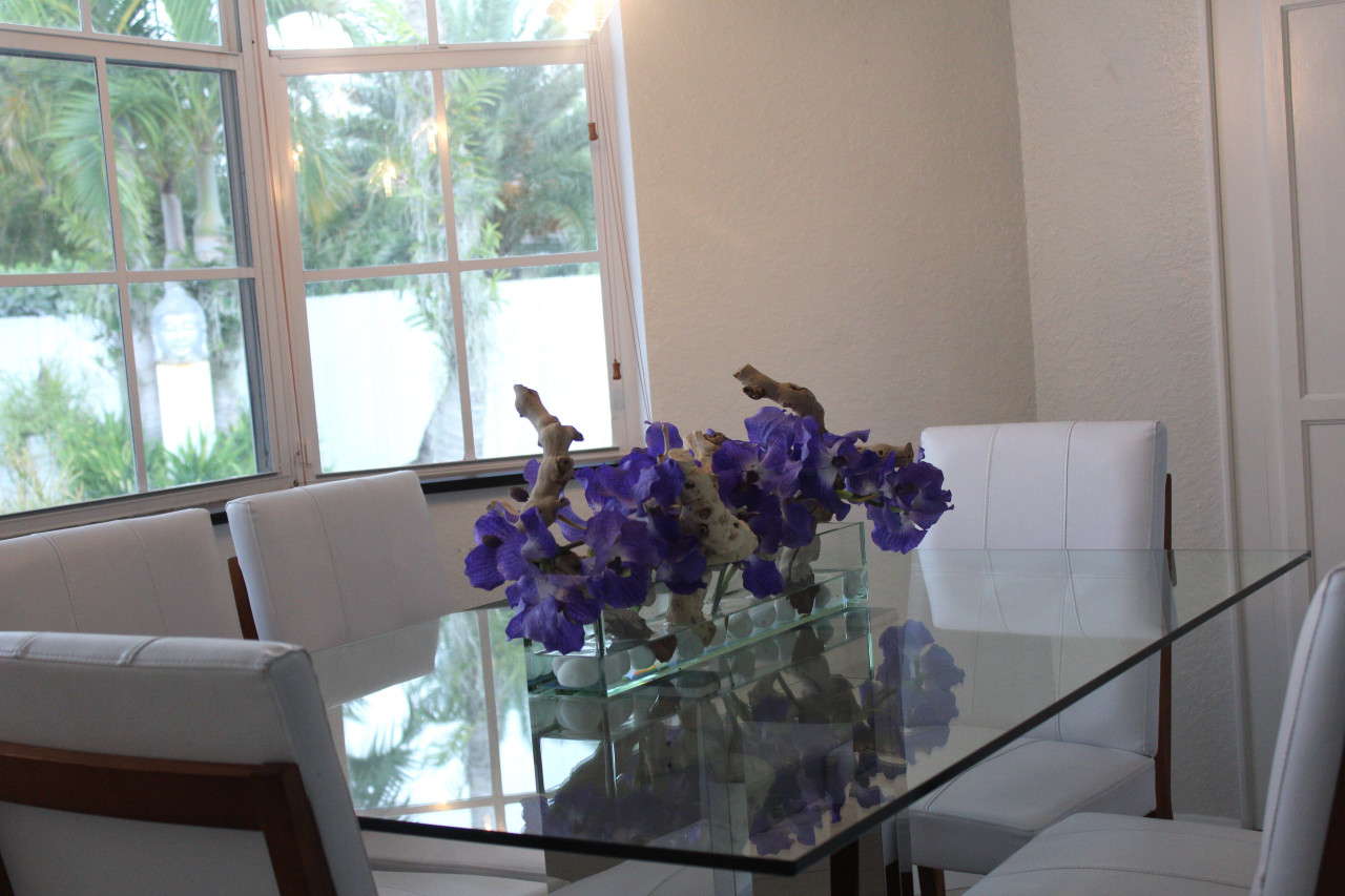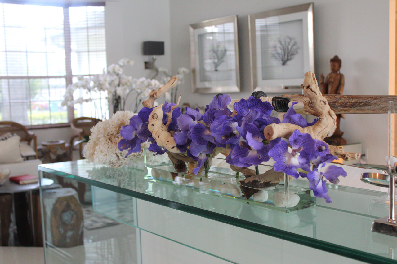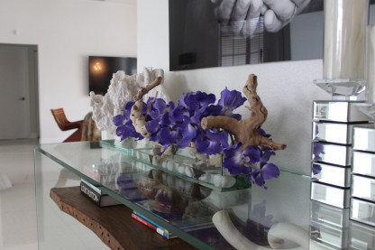24" Casa Moderna Glass Plate planter purple vanda orchids, sandblasted grape wood, white stones and our illusion water.?